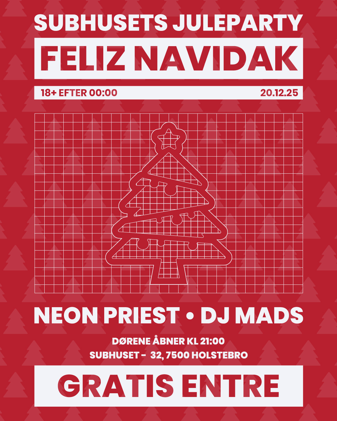 I år byder vi på livemusik fra Neon Priest og DJ Mads. Baren er billig, og i år er der endda gratis entre! Det er simpelthen ikke til at misse - så hiv fat i dine venner, og lad og sammen skabe en magisk aften, fyldt med julestemning, livemusik og dans!